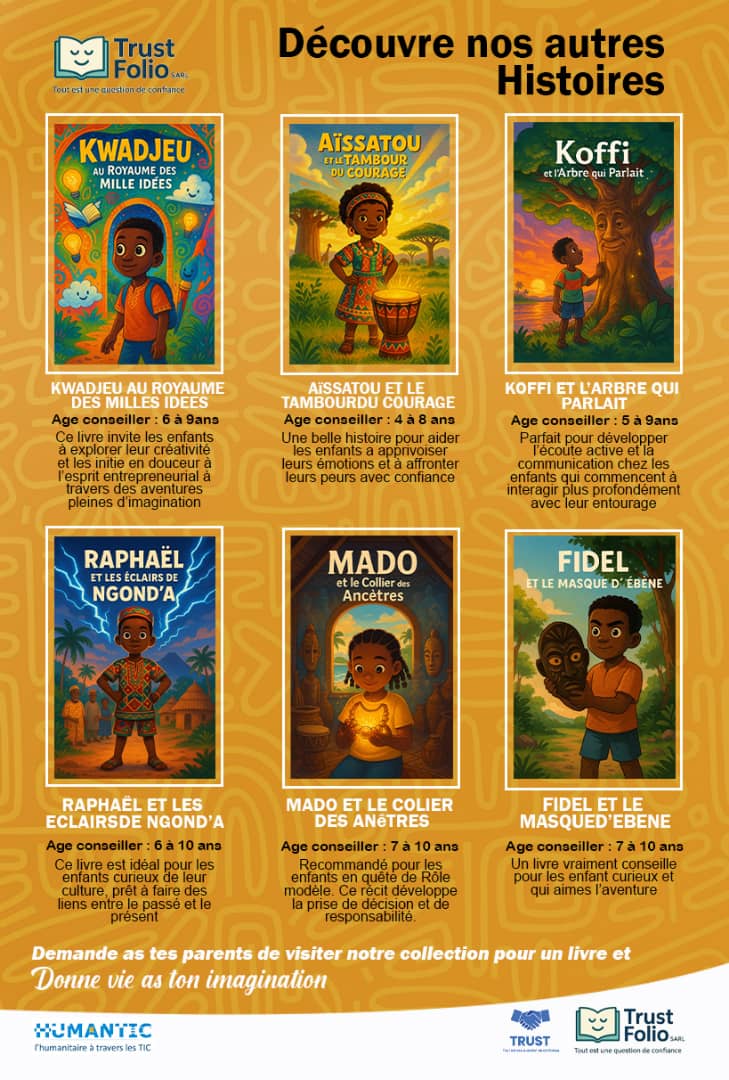 Une passerelle entre culture et éducation TrustFolio ne se contente pas de raconter des histoires ; nous créons des supports de transmission culturelle. Nos récits sont profondément ancrés dans les cultures et les valeurs africaines, offrant une alternative concrète et captivante à la dépendance aux écrans. Chaque livre est une graine plantée pour cultiver 20 vertus essentielles, telles que le courage, le respect, la solidarité et l'entrepreneuriat.